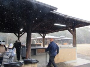 思わぬ雪に、キャンプ場の屋根は真っ白。